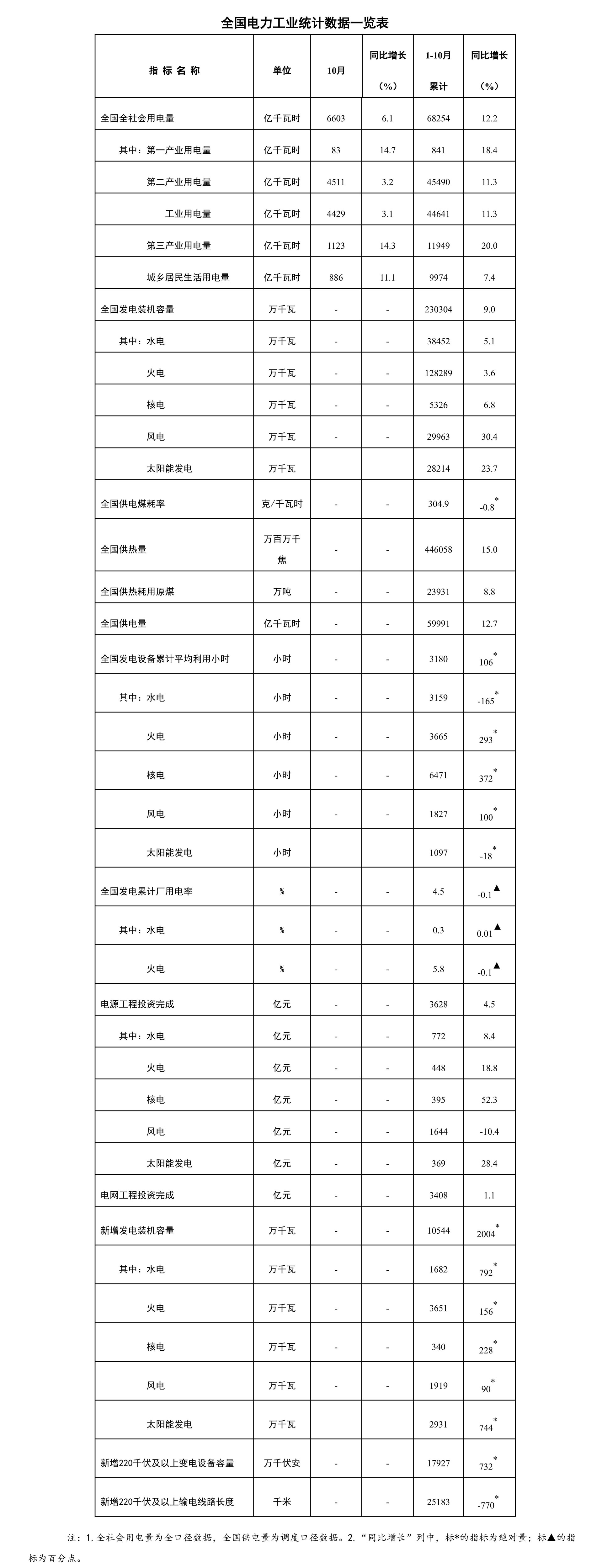 國(guó)家能源局發(fā)布1-10月份全國(guó)電力工業(yè)統(tǒng)計(jì)數(shù)據(jù)